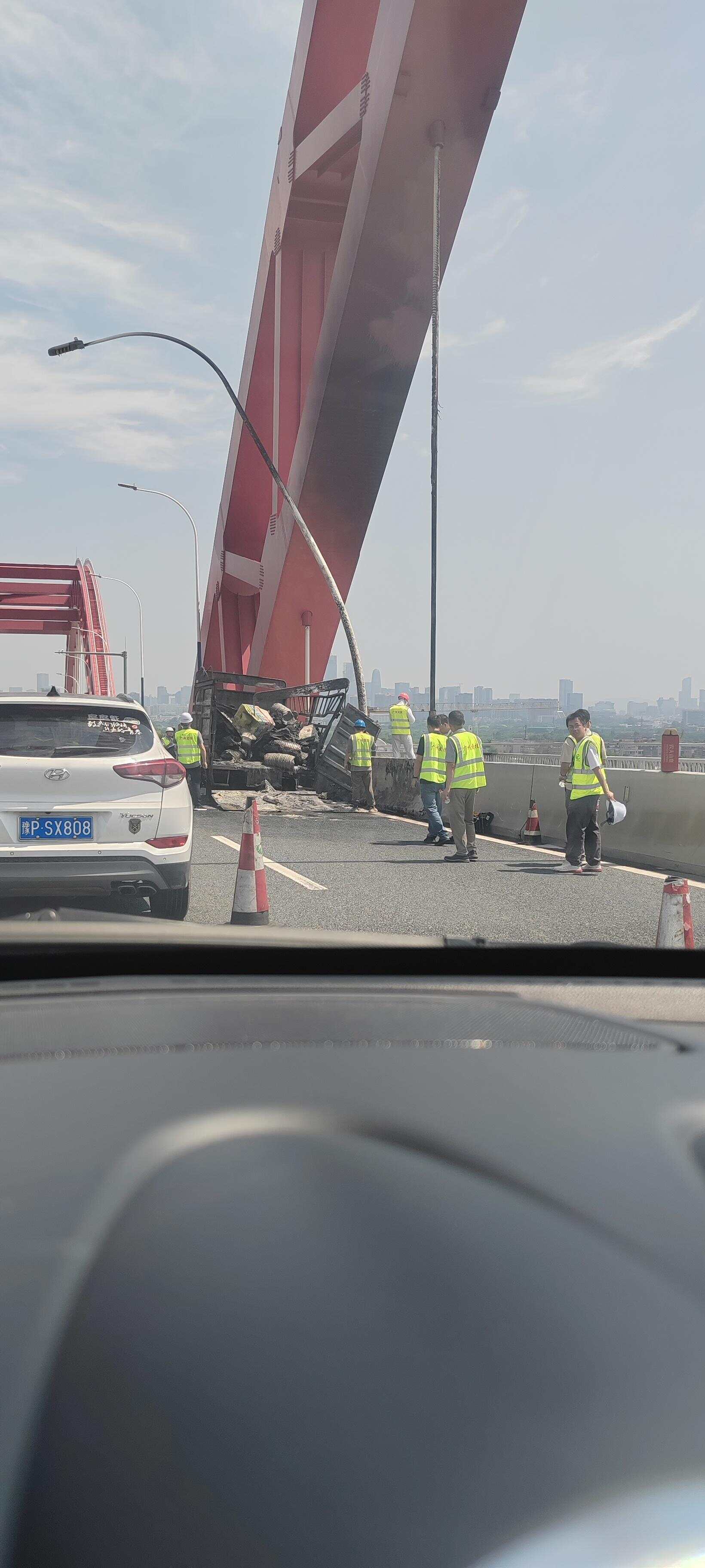 今天10时45分左右,受访者表示,桥上车辆已经可以缓慢移动,事故货车仍停留在新光大桥上。