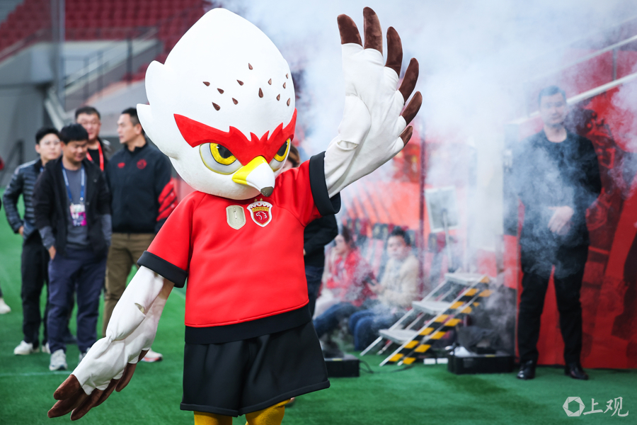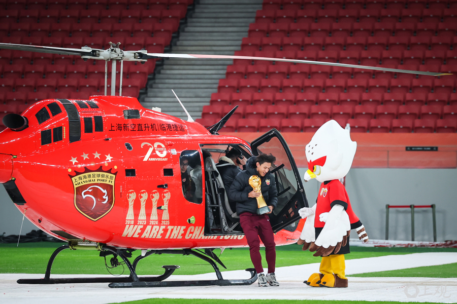在总结会开始前,队长王燊超手捧火神杯乘坐直升机降落至球场中央,并由海港吉祥物“伊戈”接机至球场,王燊超高举奖杯与来到现场的球迷们一起庆祝冠军。